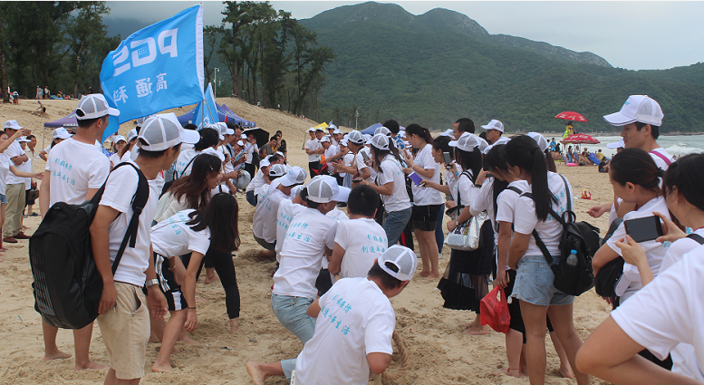 海邊拔河是一個刺激又瘋狂的游戲,雖然簡單,但考驗的是團隊的凝聚力。我們分為3個小組,每組各10個男生,其余的做為拉拉隊,獲勝的一組,獎金1000元,由董事長現場發紅包。