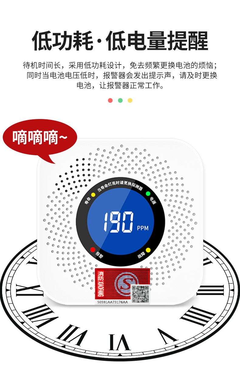一氧化碳報警器(型號PA-007) 產品規格 功能特點 資料下載 一氧化碳報警器(型號PA-007)1.探測氣體:一氧化碳2.報警方式:高音報警、聲光報警3.材質:ABS阻燃材質4.產品保險:1000萬承險適用場景:適用于廚房、浴室、起居室、火鍋包廂、飯堂等長時間空氣不流通的場所安裝一氧化碳報警探測器