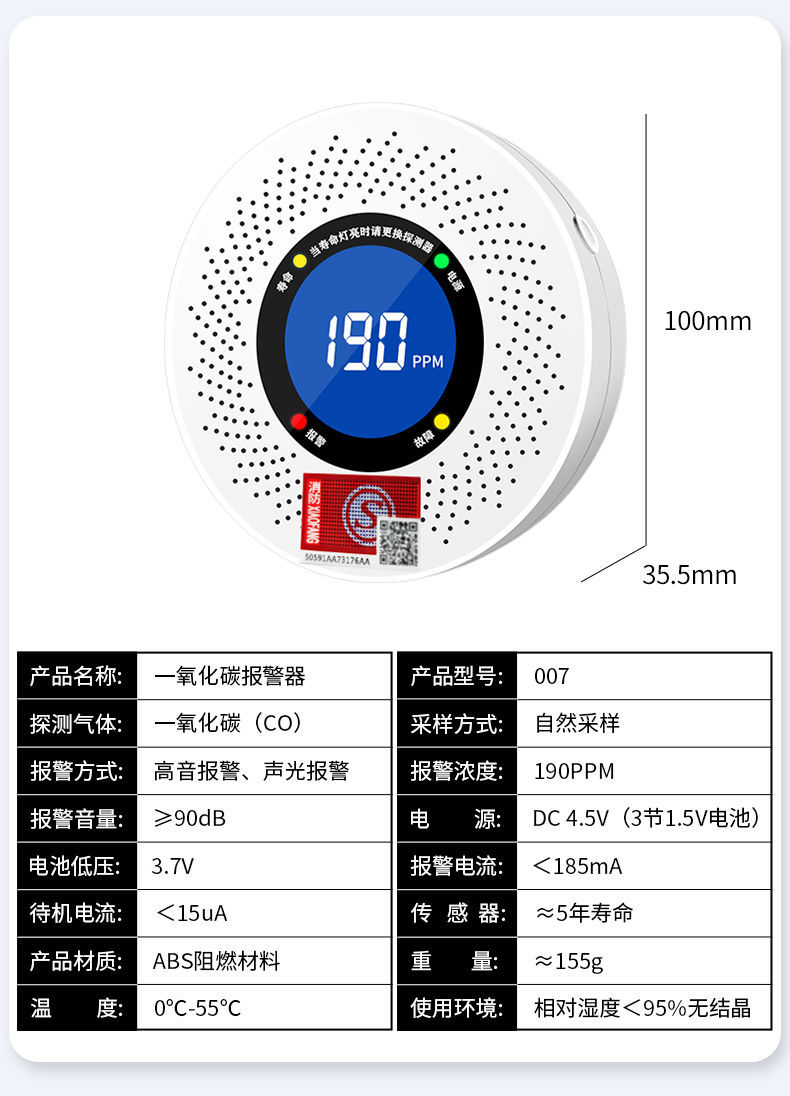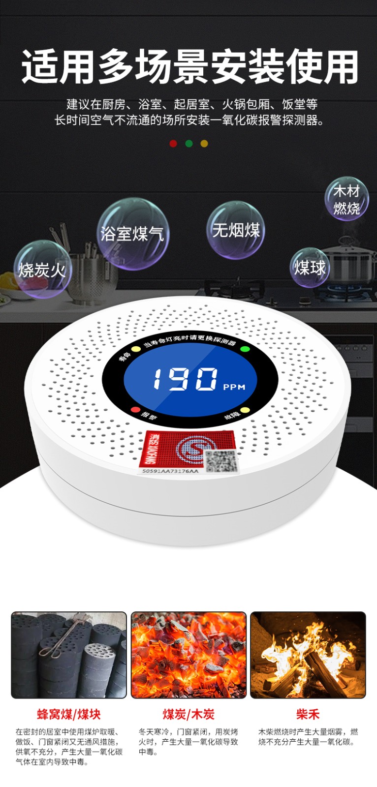一氧化碳報警器(型號PA-008) 產(chǎn)品規(guī)格 功能特點 資料下載 一氧化碳報警器(型號PA-008)檢測氣體、燒煤、燒柴、燒炭、蜂窩媒、露營封閉環(huán)境、封閉車內(nèi)85分貝報警音量.LED液晶屏幕顯示故障自檢: 綠燈(正常)、黃燈 (故障、需要檢修) 紅燈(氣體濃度超標(biāo)) 5.報警方式:蜂鳴聲提示 6. 產(chǎn)品保險:1000萬承險 7. ABS阻燃材質(zhì)適用場景:適用于廚房、浴室、起居室、火鍋包廂、飯?zhí)玫乳L時間空氣不流通的場所安裝一氧化碳報警探測器