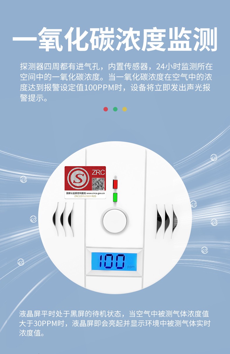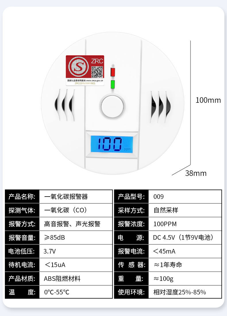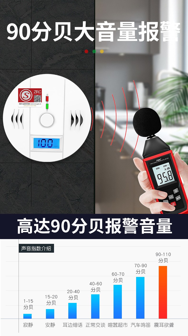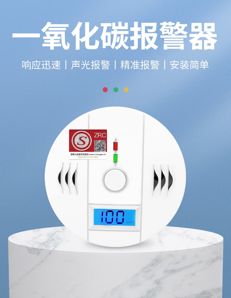 一氧化碳報警器(型號PA-009) 產品規格 功能特點 資料下載 一氧化碳報警器(型號PA-009)1.檢測氣體、燒煤、燒柴、燒炭、蜂窩媒、露營封閉環境、封閉車內2.85分貝報警音量3..LED液晶屏幕顯示4.故障自檢: 綠燈(正常)、黃燈 (故障、需要檢修) 紅燈(氣體濃度超標)5.報警方式:蜂鳴聲提示 6. 產品保險:1000萬承險7. ABS阻燃材質適用場景:適用于廚房、浴室、起居室、火鍋包廂、飯堂等長時間空氣不流通的場所安裝一氧化碳報警探測器