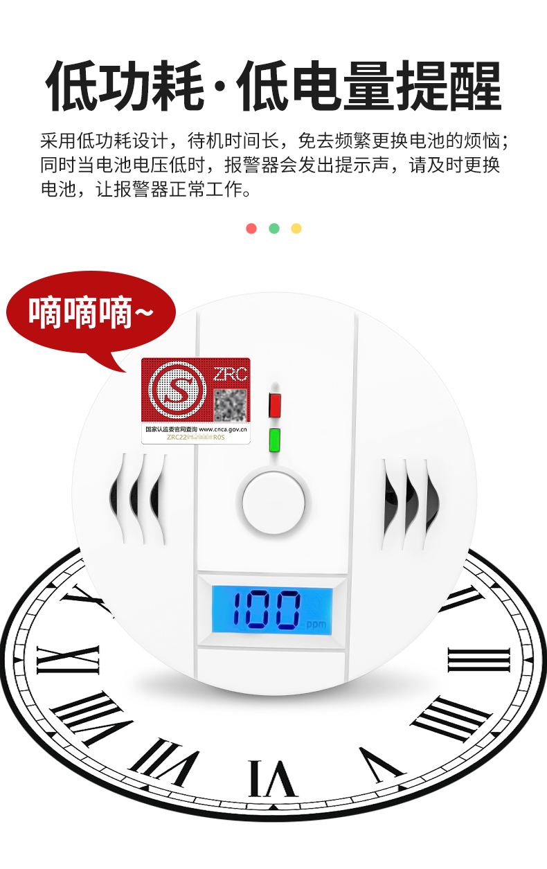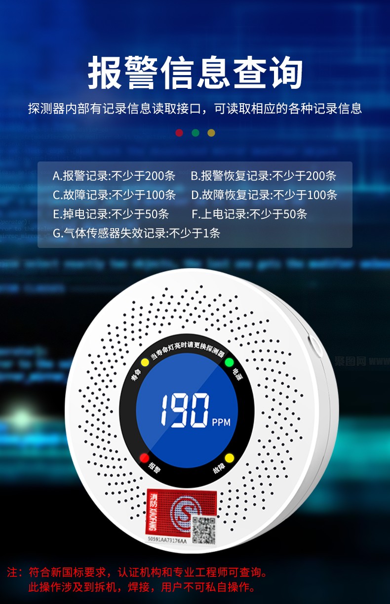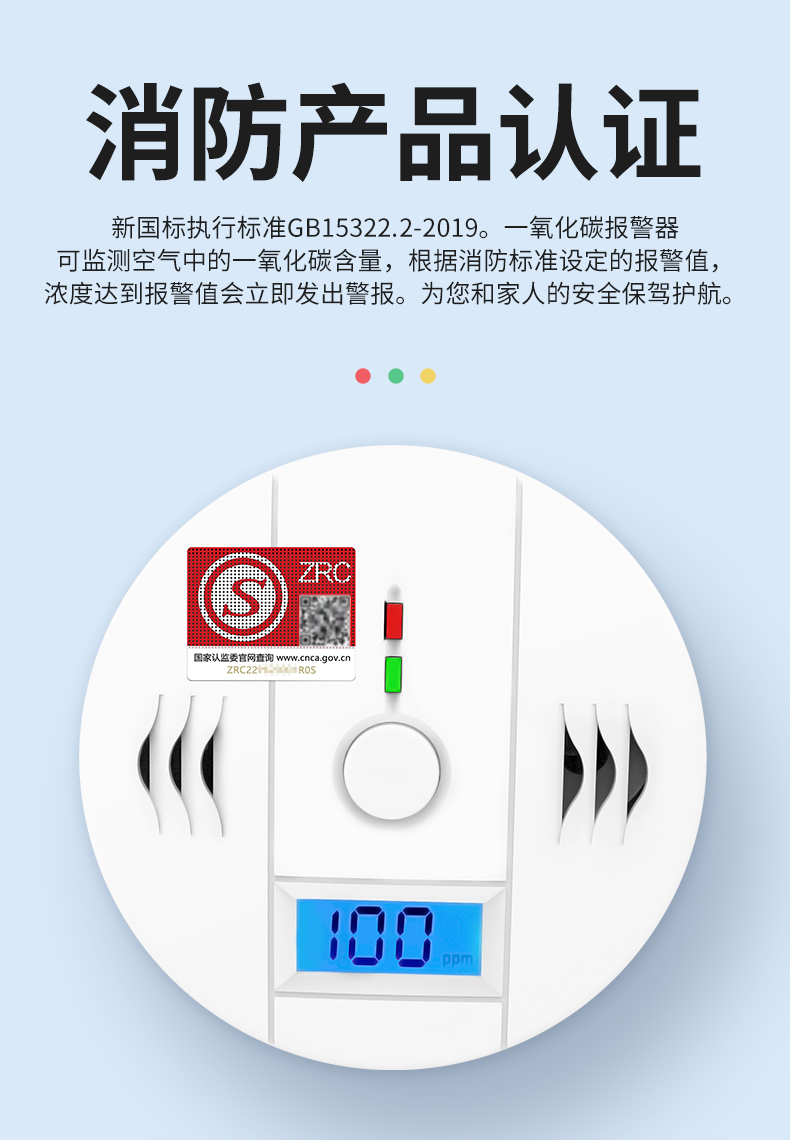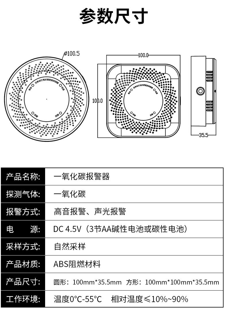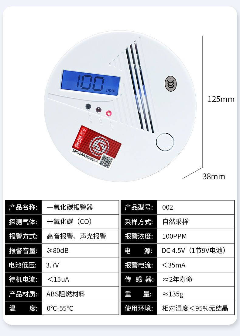 一氧化碳報警器(型號PA-009) 產品規格 功能特點 資料下載 一氧化碳報警器(型號PA-009)1.檢測氣體、燒煤、燒柴、燒炭、蜂窩媒、露營封閉環境、封閉車內2.85分貝報警音量3..LED液晶屏幕顯示4.故障自檢: 綠燈(正常)、黃燈 (故障、需要檢修) 紅燈(氣體濃度超標)5.報警方式:蜂鳴聲提示 6. 產品保險:1000萬承險7. ABS阻燃材質適用場景:適用于廚房、浴室、起居室、火鍋包廂、飯堂等長時間空氣不流通的場所安裝一氧化碳報警探測器