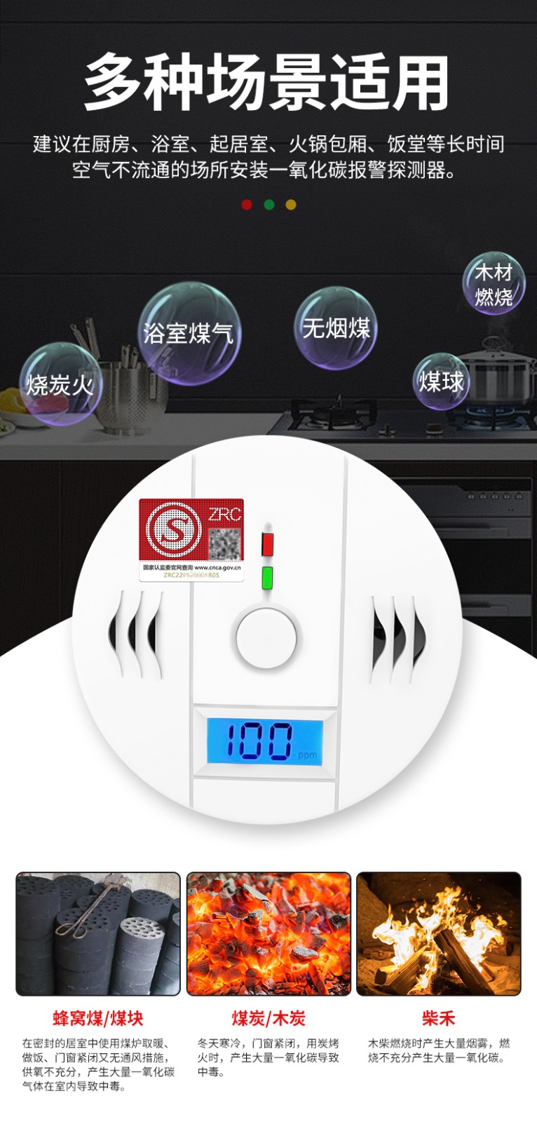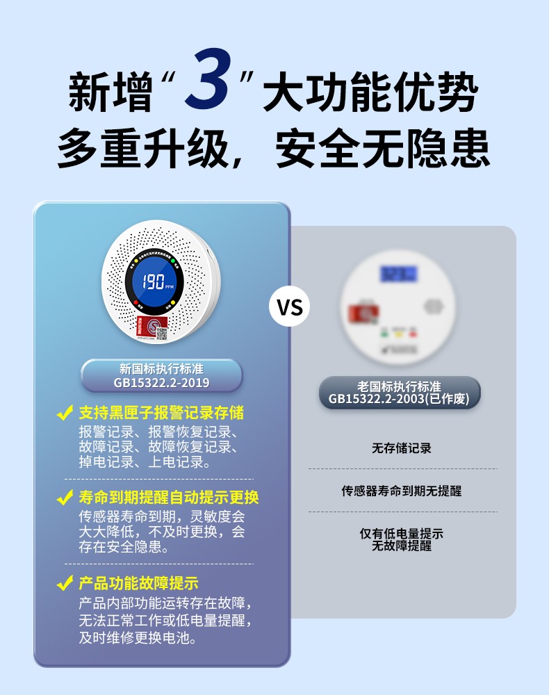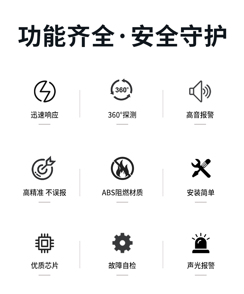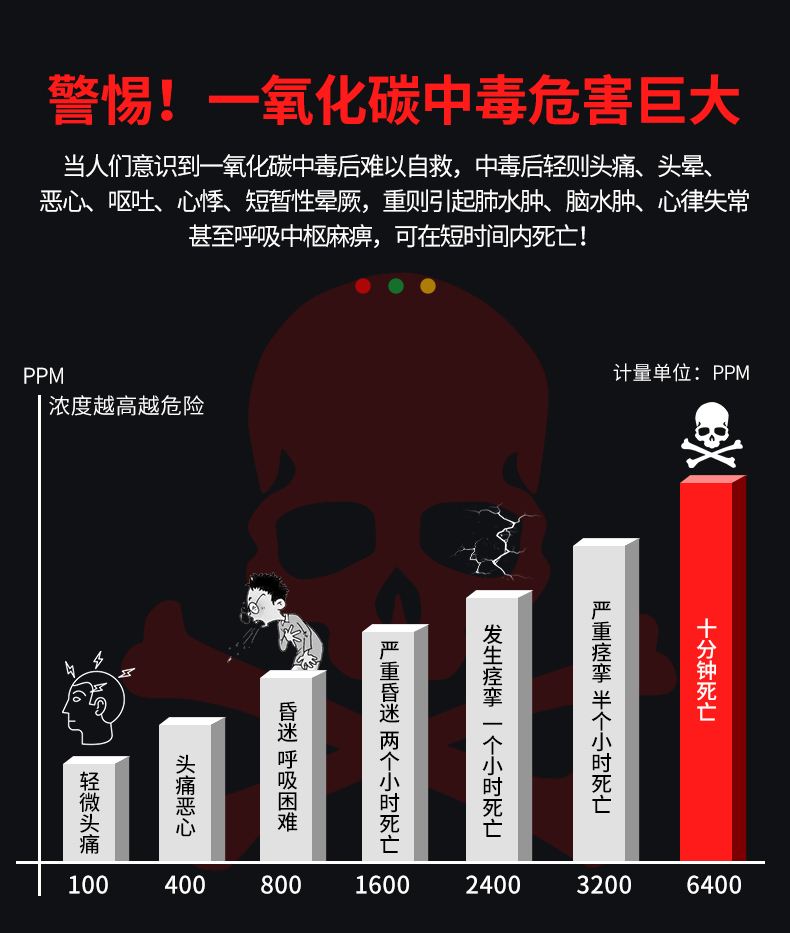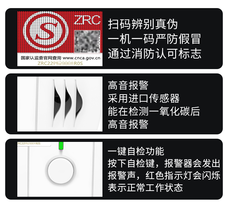 一氧化碳報警器(型號PA-009) 產品規格 功能特點 資料下載 一氧化碳報警器(型號PA-009)1.檢測氣體、燒煤、燒柴、燒炭、蜂窩媒、露營封閉環境、封閉車內2.85分貝報警音量3..LED液晶屏幕顯示4.故障自檢: 綠燈(正常)、黃燈 (故障、需要檢修) 紅燈(氣體濃度超標)5.報警方式:蜂鳴聲提示 6. 產品保險:1000萬承險7. ABS阻燃材質適用場景:適用于廚房、浴室、起居室、火鍋包廂、飯堂等長時間空氣不流通的場所安裝一氧化碳報警探測器